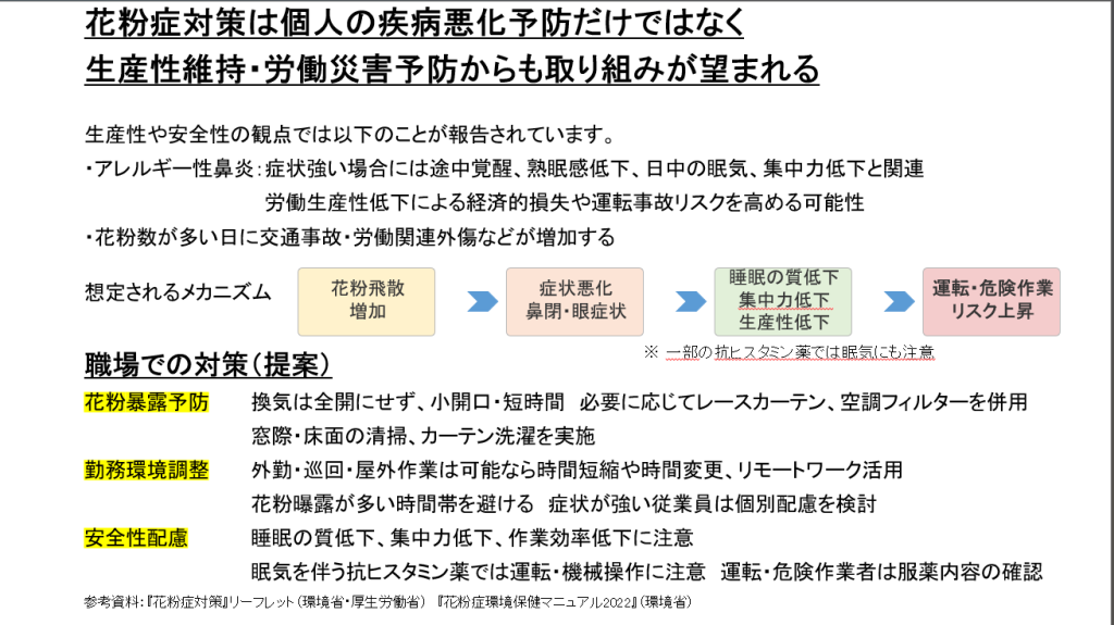 近年、こうした影響を裏づける研究が積み重なってきました。アレルギー性鼻炎と睡眠障害の関連、労働生産性への影響、高花粉日に交通事故や労働関連外傷が増える可能性を示す研究まで報告されています。日本政府も花粉症を個人のつらさにとどまらない社会的課題として位置づけ、花粉曝露を減らす働き方や企業での対策推進を打ち出しています。